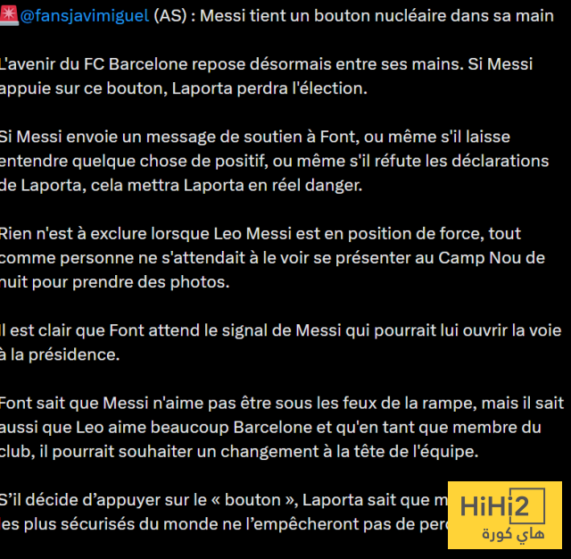 اذا ارسل ميسي رسالة دعم لفونت او لمح باشارة ايجابية او حتى دحض بعد تصريحات لابورتا ستعرض لابورتا لخطر حقيقي