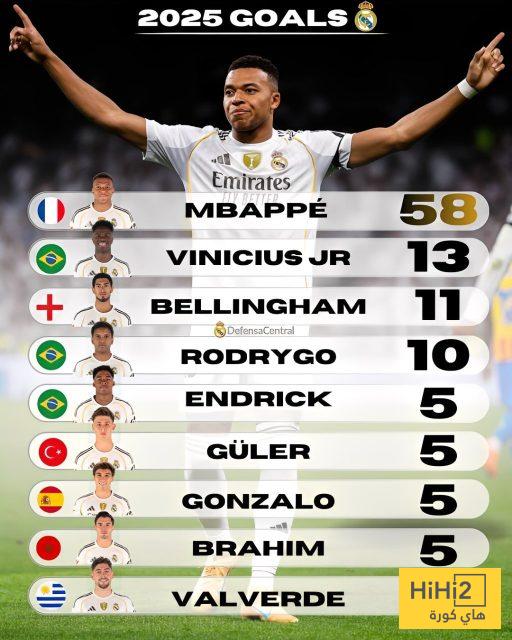 وبعد مبابي يأتي فينيسيوس جونيور برصيد 13 هدفا وجود بيلينغهام برصيد 11 هدفا ورودريغو برصيد 10 أهداف.