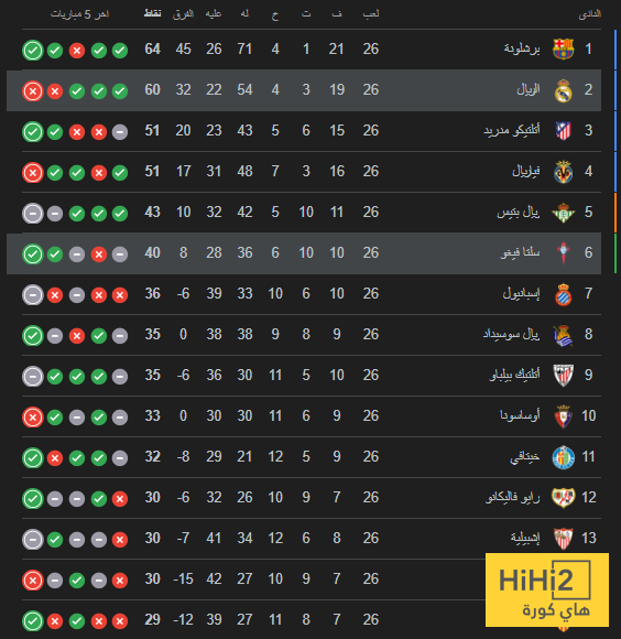 سيلتا فيغو في المركز السادس من ترتيب الدوري برصيد 40 نقطة .
