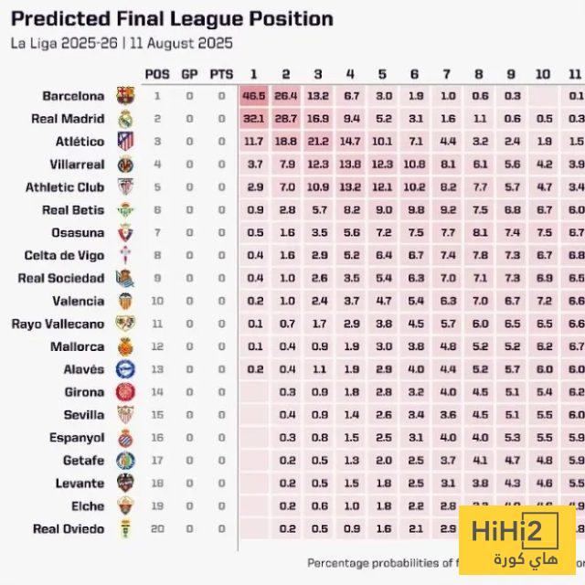 بحسب التحليلات المعتمدة على تقنيات الذكاء الاصطناعي، يتصدر برشلونة قائمة المرشحين بنسبة 46.5% لإعادة التتويج باللقب، متقدمًا على غريمه التقليدي ريال مدريد الذي حصد نسبة 32.1% للفوز بالمركز الأول و28.7% لحصد المركز الثاني، ما يضعه خلف كتيبة المدرب هانز فليك في سباق الصدارة.