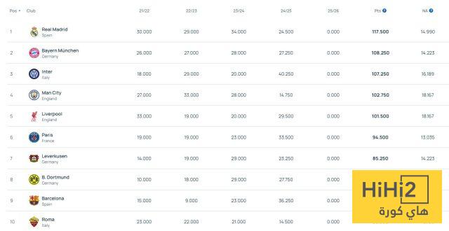 بايرن ميونخ يحتل المركز الثاني ثم انتر ميلان وصيف بطل أوروبا ثالثا ويأتي مانشستر سيتي في المركز الرابع.
