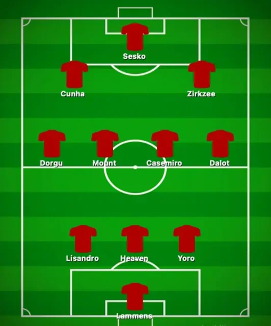 ومن أجل البحث عن حلول، كشف موقع تريبيونا عن التشكيلة المتوقعة للشياطين الحمر بدون قائدهم، حيث من المتوقع أن يعتمد أموريم على ماسون ماونت مكان فيرنانديز.